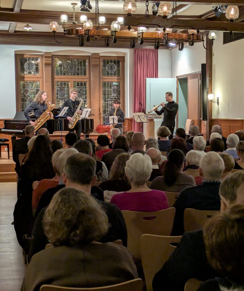Einen genussvollen Abend erlebten die Besucher des Frühjahrskonzerts des Pelikanvereins am vergangenen Freitagabend im vollbesetzten Bürgersaal des Alten Rathauses in Bretten. Für den musikalischen Genuss sorgten die Schüler/innen der Jugendmusikschule Bretten, eingeleitet durch das Saxophonensemble und Alexander Dirks am Klavier. In seiner Begrüßungsrede stellte Prof. Winkelmann, Vorsitzender des Pelikanvereins, die Bedeutung der Therapieergänzungen durch Mittel des Vereins heraus. Dies sei nur möglich durch die großzügigen Spenden an den Verein. Auch sei es wichtig, immer wieder neue Mitglieder zu gewinnen, um die Unterstützung der Palliativstation an der Rechbergklinik auf lange Sicht aufrecht erhalten zu können. Durch das musikalische Programm führte Fr. Jaggy, Leiterin der Jugendmusikschule. Es musizierten sehr junge Künstler wie z.B. Oskar Hörandel am Cello oder Lena Koppenhöfer am Horn, aber auch Erfahrene wie Julian Wagenknecht, der im Musikzug des MGB mit der Trompete ins Abitur geht. Den Schluss gestaltete das Celloduo Kalle Mumm und Eva Clemens. Der Genussabend klang aus mit einer kleinen Bewirtung. Die Gebäckteilchen wurden, wie auch schon bei den zurückliegenden Konzerten, von Hr. Gerweck, ehem. Inhaber der gleichnamigen Bäckerei, gespendet, die Getränke stiftete der Vorstand des Pelikanvereins. (Text und Bild: B. Schaarschmidt)